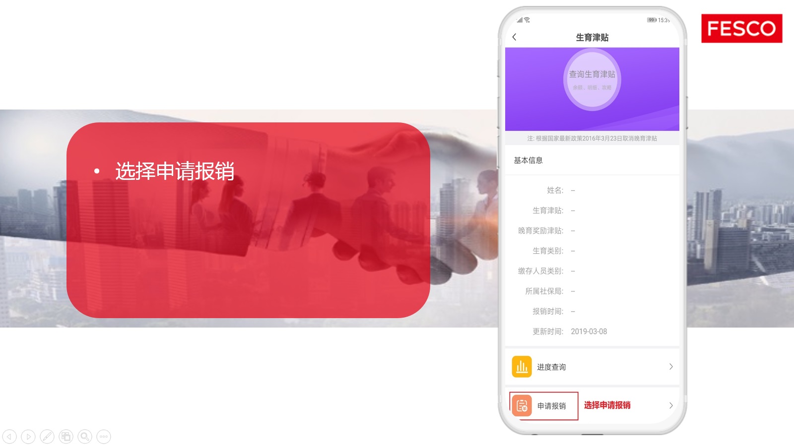 隨著“互聯(lián)網(wǎng)+服務(wù)”的深入發(fā)展, FESCO從客戶實(shí)際需求出發(fā),將人力資源服務(wù)與互聯(lián)網(wǎng)技術(shù)完美結(jié)合,現(xiàn)在,您可以通過FESCO APP, 實(shí)現(xiàn)生育津貼在線審核業(yè)務(wù)的辦理。